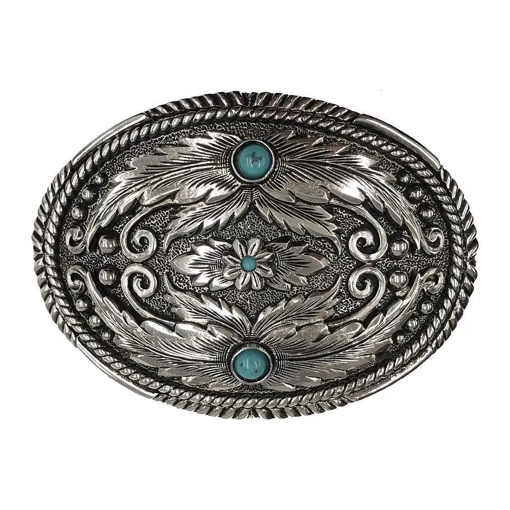 Oval buckle with fancy feathers and flower design with 3 turquoise stones.