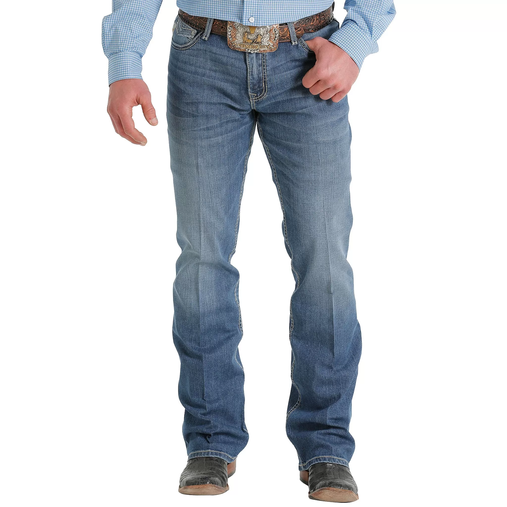 Celebrate the summer season in our medium stone washed IAN. A right-hand broken twill performance denim is finished with heavy hand sanding, whiskers, chevrons and grinding. Subtle back pocket embroidery and triple-needle cord stitching add to the youthful look.