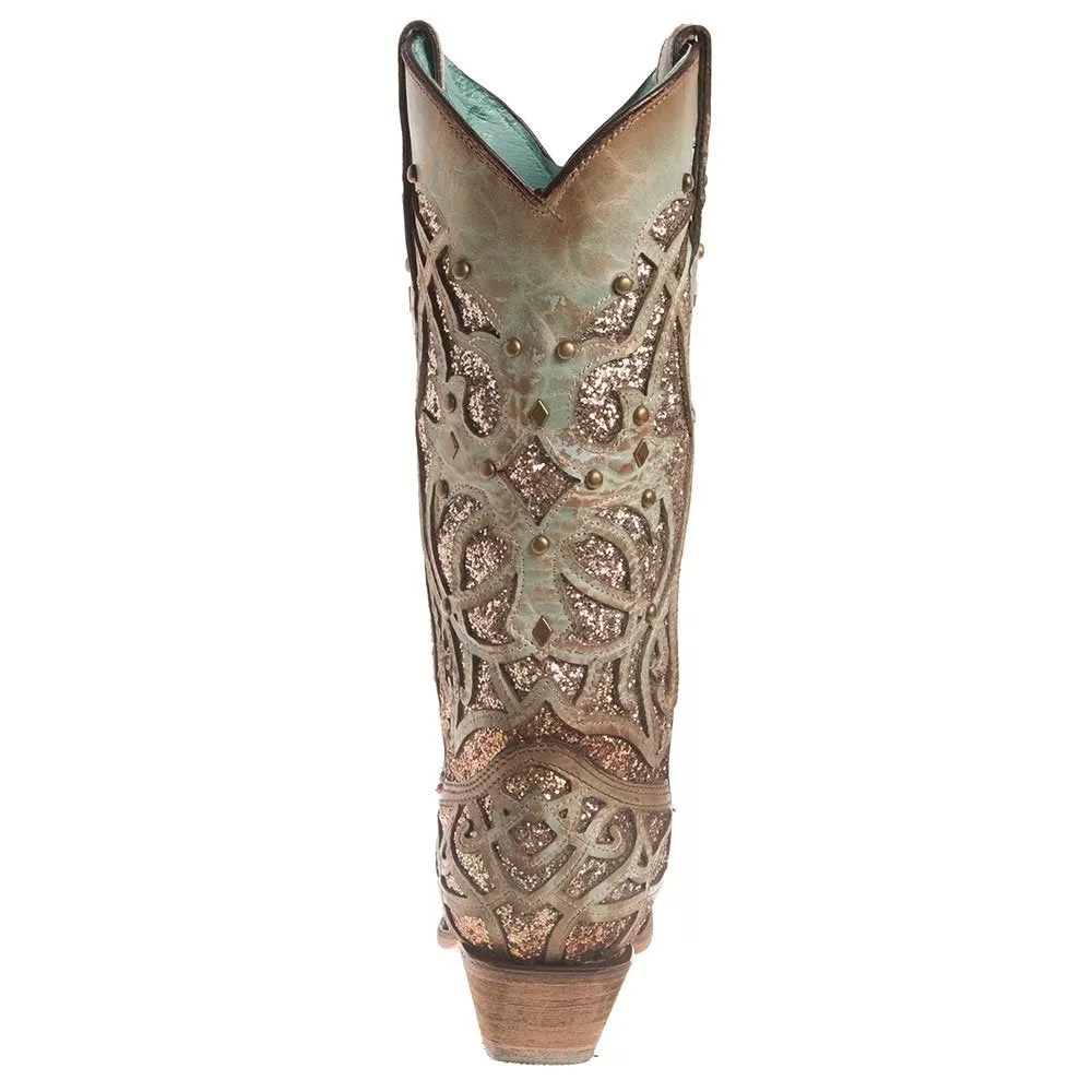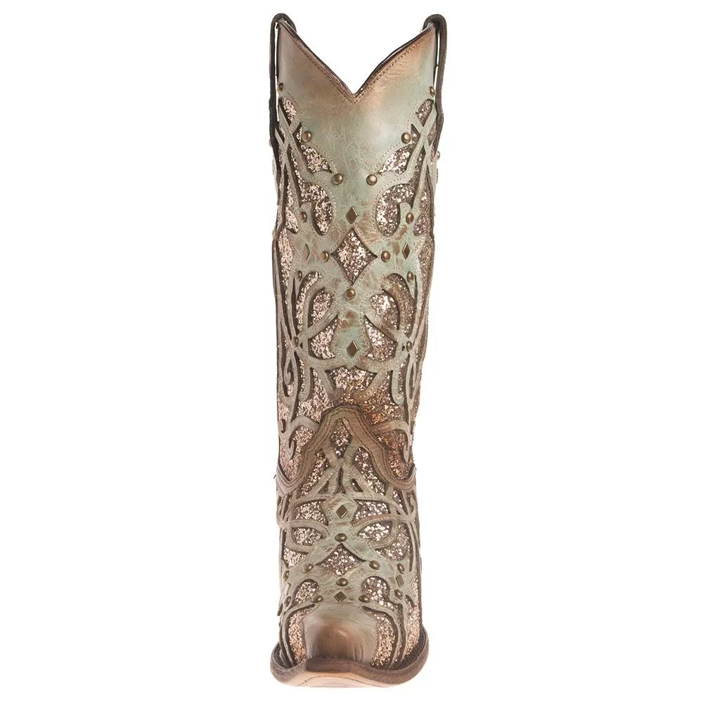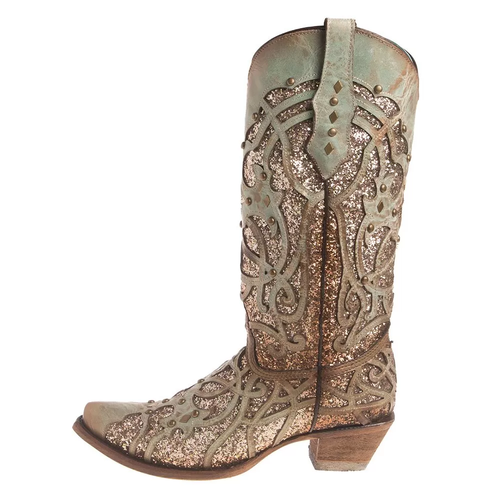 Ladies step out in style and comfort in our mint glitter inlay snip toe cowgirl boots from Corral Boot Company.