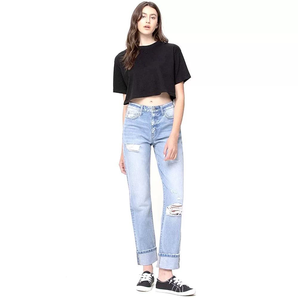 The light washed denim with grinding details, cuffed hem, subtle fading, and whiskering gives this style the vintage vibe we’re all going for.