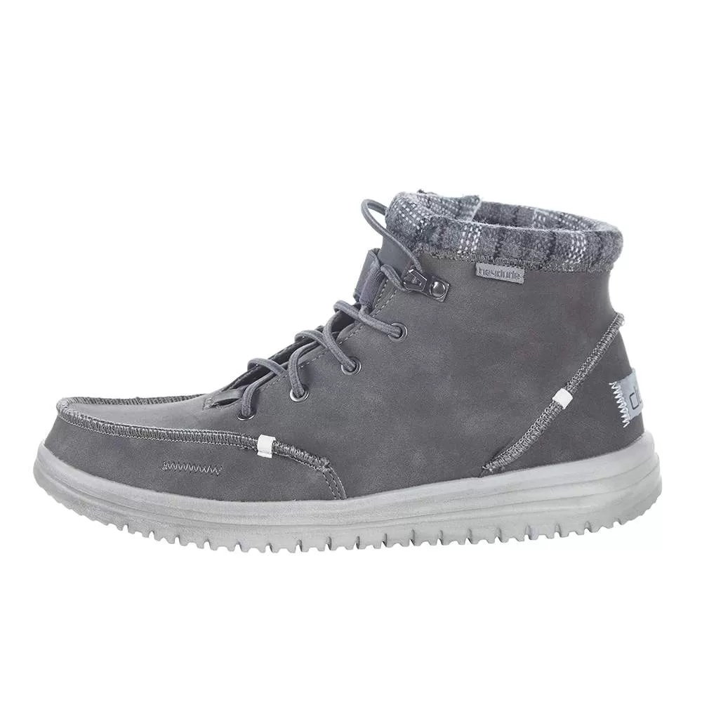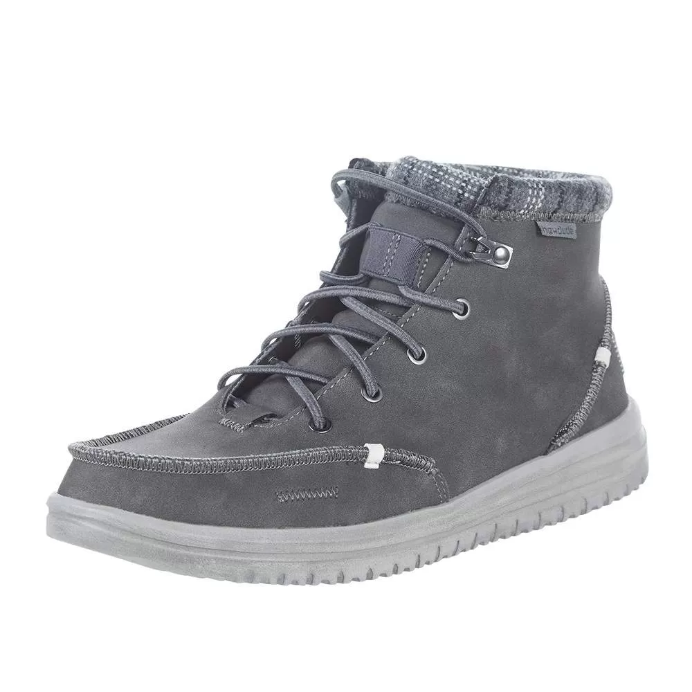 The Bradley style is a slip on moccasin boot from Hey Dude. These rugged yet lightweight shoes are made from water repellant recycled leather with a breathable wool lining.