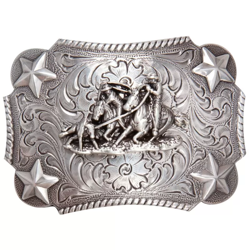 This silver buckle by M&FÂ will make a perfect gift! Actual colors and patinas may vary slightly. Nocona protects the finish with a protective coating to prevent tarnishing. This buckle has an image of team roping in the center and a raised star in each of the corners. There is a rope trim on the edges and the center has floral engraving to add details.