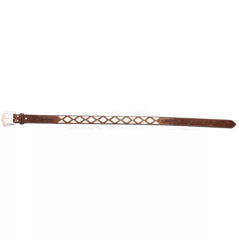 This men’s western belt by M&F is a 1 1/2 wide medium brown leather belt with brindle and diamond shaped silver conchos. The is darker tooled leather on the ends and lighter brown brindle in the center that has diamond shaped silver conchos on top of it. The leather belt keeper is a matching tooled leather and is great for keeping the end of the belt in place! This belt is a classic look for guys to wear when they are wanting to look nice in their jeans, boots and button down shirt. The buckle on this belt is silver with traditional floral engraving that matches the diamond shaped conchos. This is a quality leather belt that will fit any of your jean belt loops and dress you up in a flash! Where this western belt with confidence with a pair of nice jeans and boots with your favorite color button down shirt and you will look great!