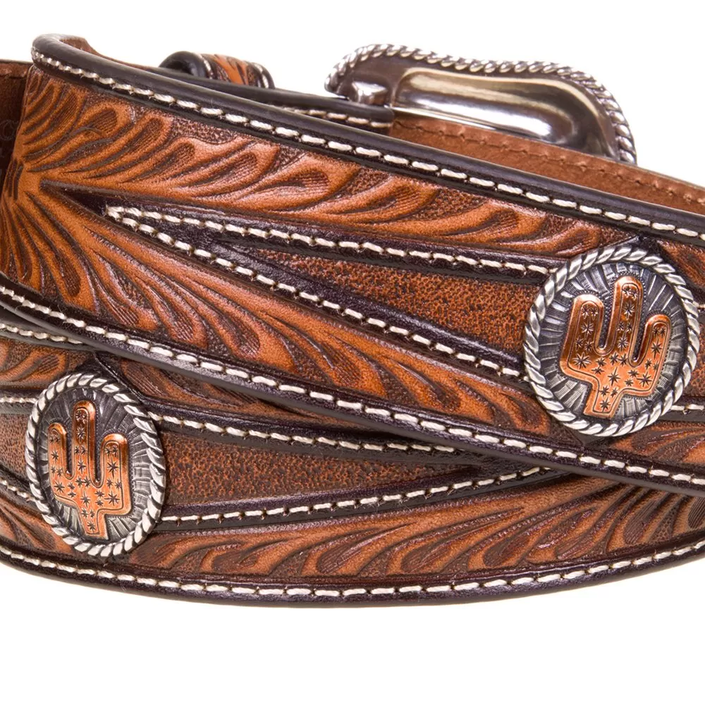 Men’s embossed belt with cactus concho’s. Belt tapers from 1 3/4″ to 1 1/2″.