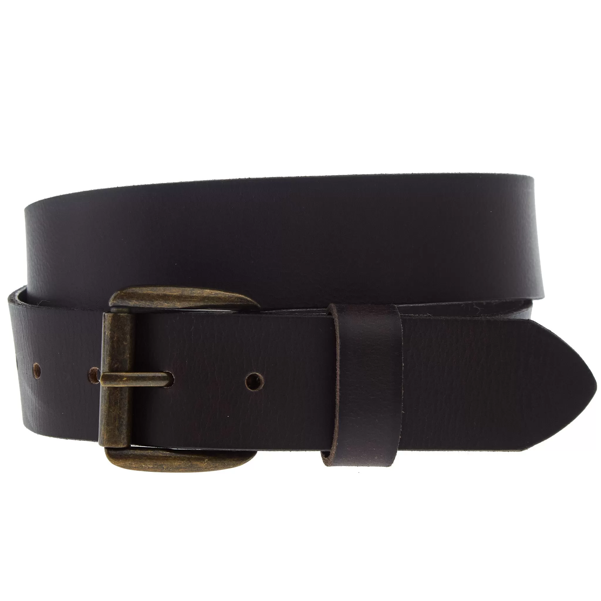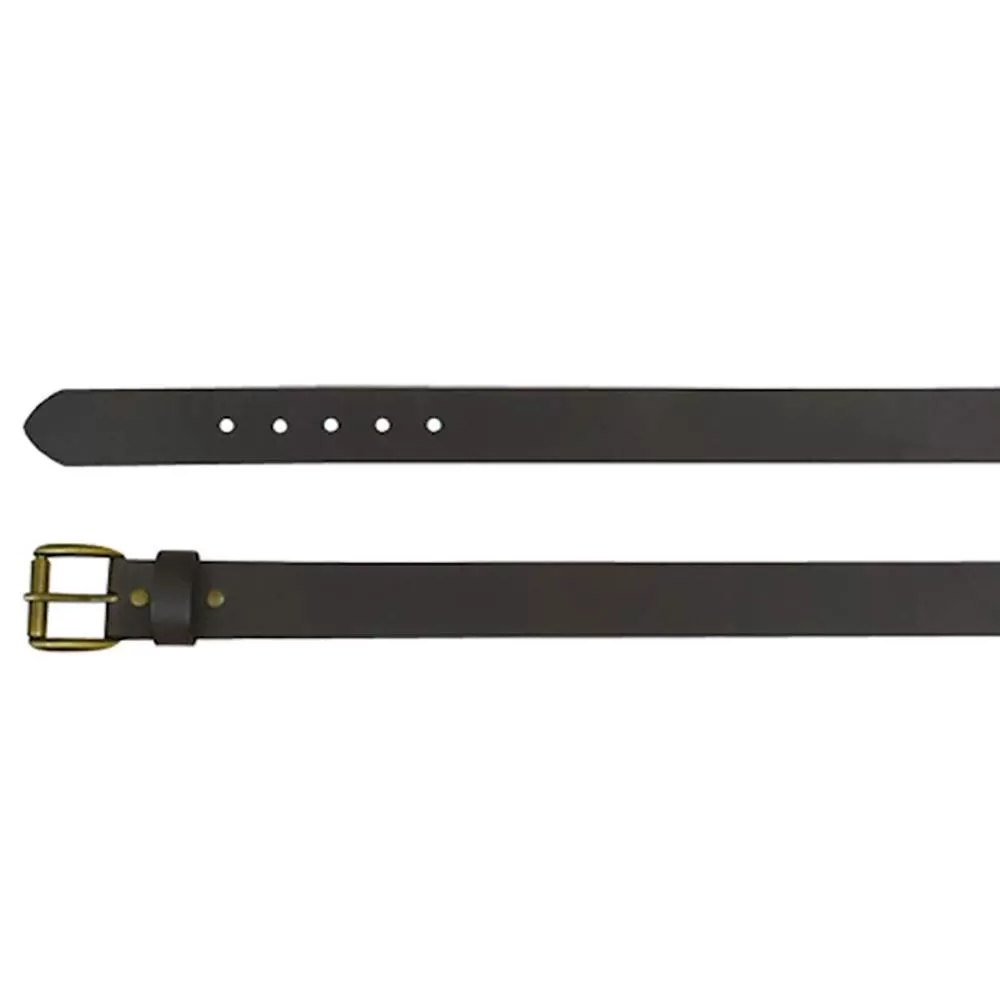 This JP West Men’s belt features dark brown bomber leather and a removable antique brass roller buckle.