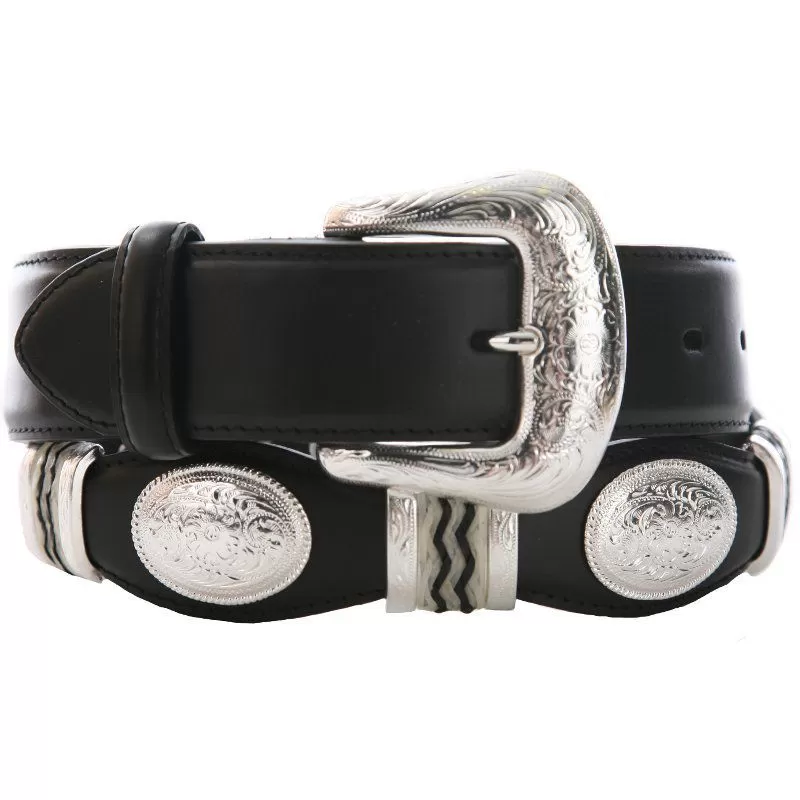 This men’s belt by Tony Lama is made of black leather and has a silver engraved belt buckle with a leather keeper. There are silver floral engraved conchos.