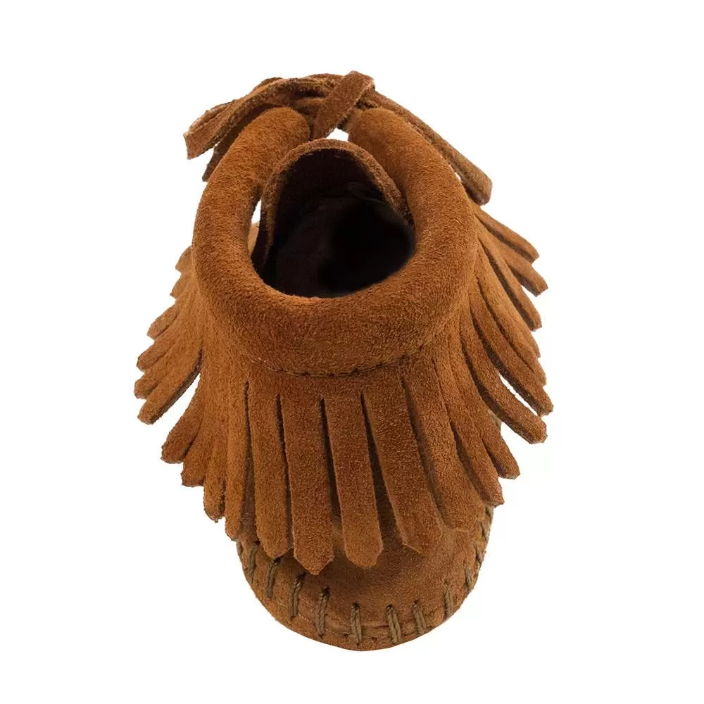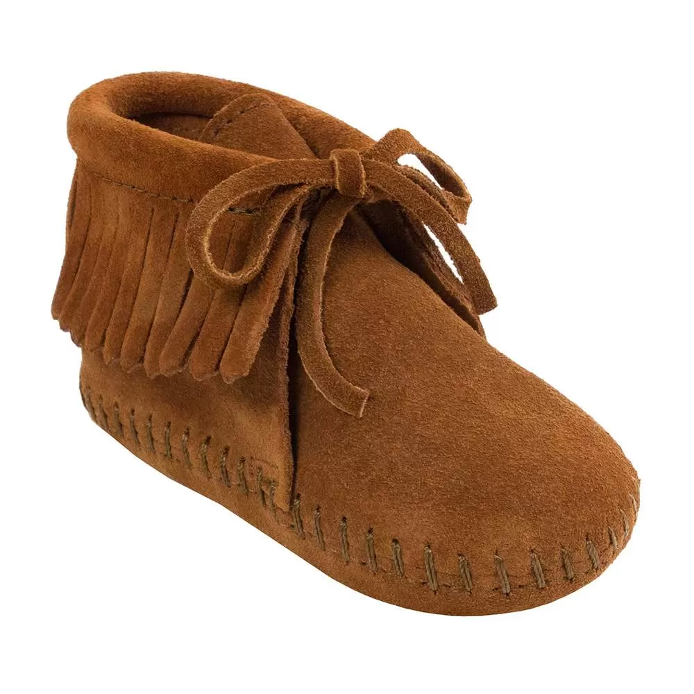 Minnetonka fringe infant booties! Product care is not included. However Minnetonka has complied information on product care.
