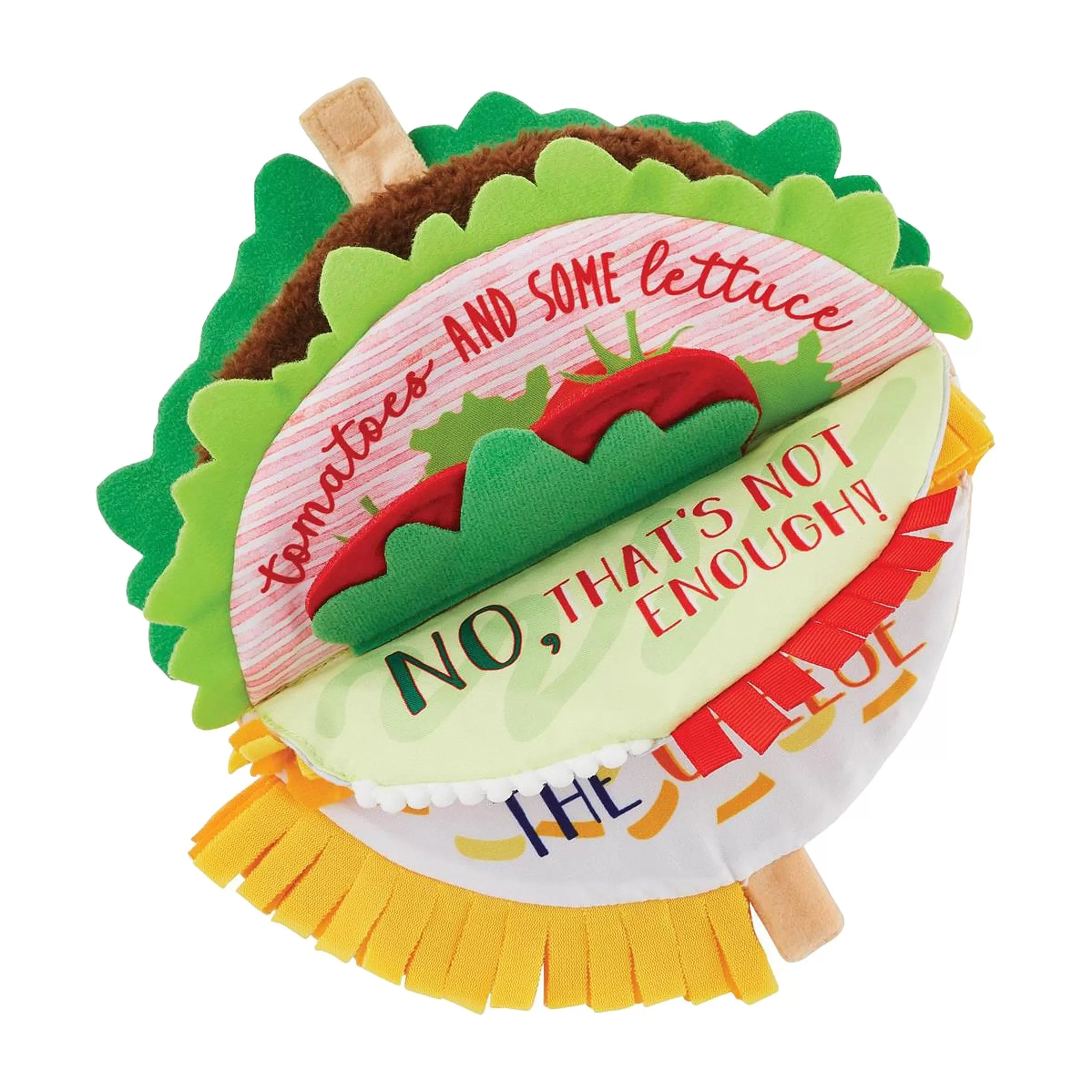 Taco ’bout a yummy taco baby book. The taco shaped soft baby safe book features tactile pages. The book is about all the toppings it takes to make a taco complete including tomatoes, lettuce and cheese!