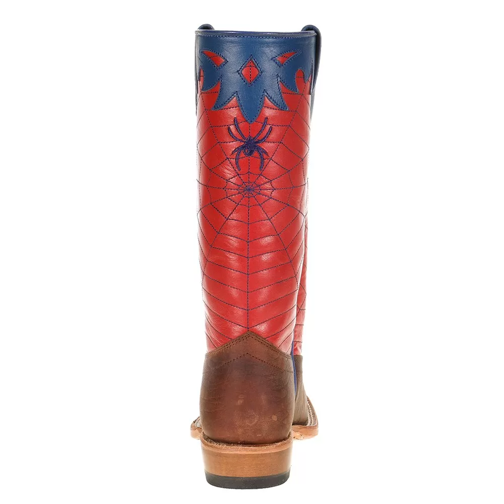 Let your little cowboy feel like a super hero in these Olathe Red & Blue Spider Web Cowboy Boots! These buckaroo-style cowboy boots feature a Toast Bison vamp, red stovepipe top with blue spider web stitching, and blue web-inspired design collar. These boots also showcase a square toe, riding heel, double stitch welt, and leather outsoles.