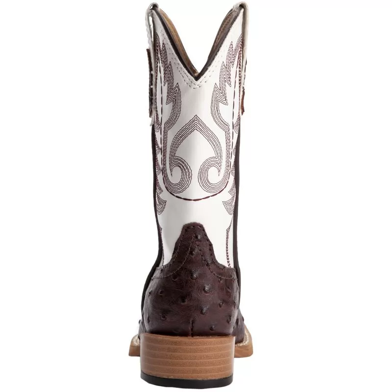 Make these Kid’s Roper Brown Ostrich Print Cowboy Boots your little one’s first pair of boots! The brown ostrich print vamp coordinates well with the white top and western stitch pattern. These boots also feature a square toe, padded insole for added comfort, and rubber outsole.