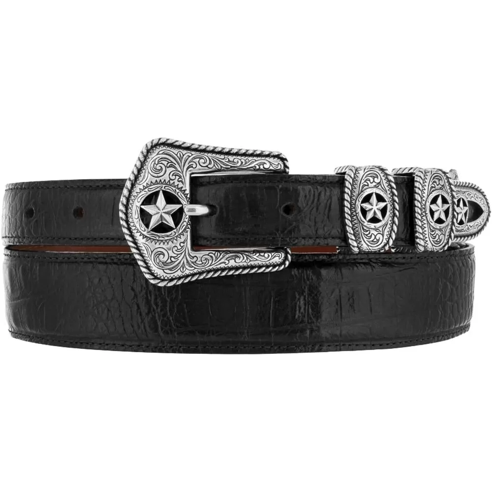 This Tony Lama belt is made from genuine full grain leather with a black croc print. It features a silver star removable buckle and is 1- 1 1/4” tapered.