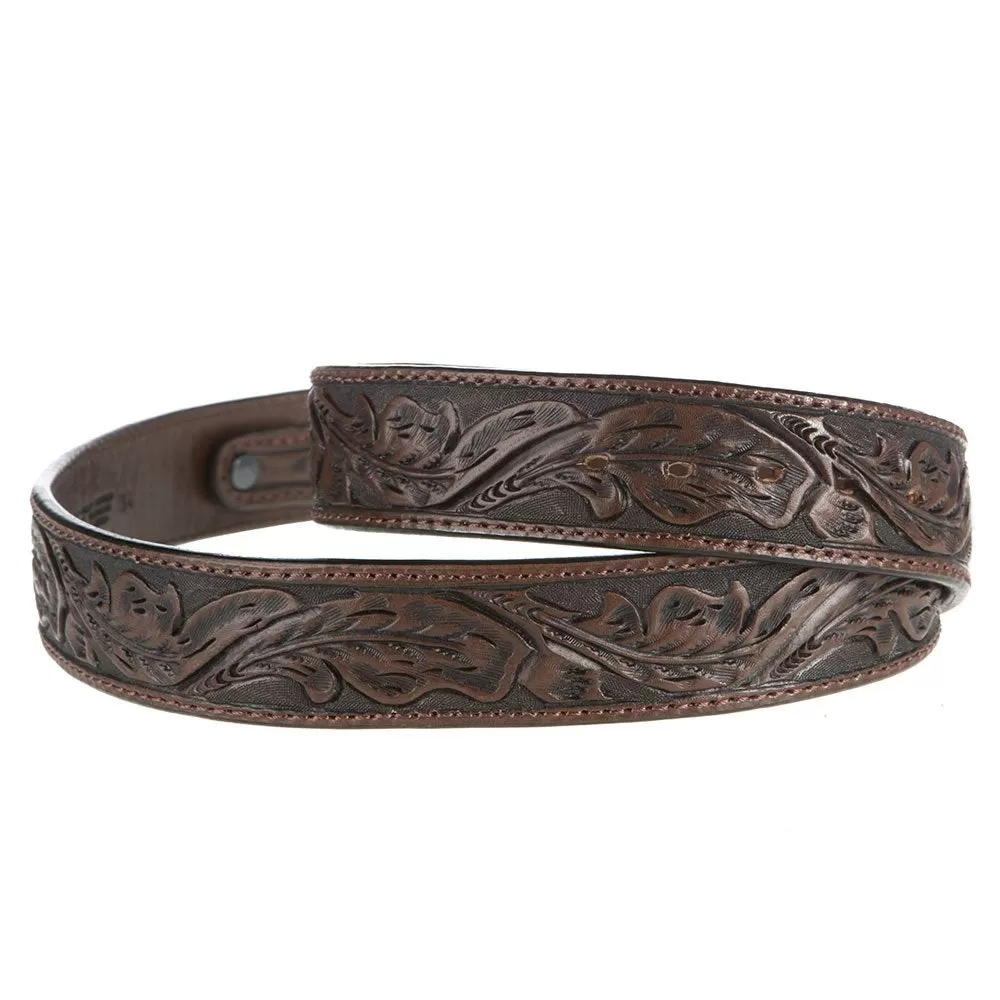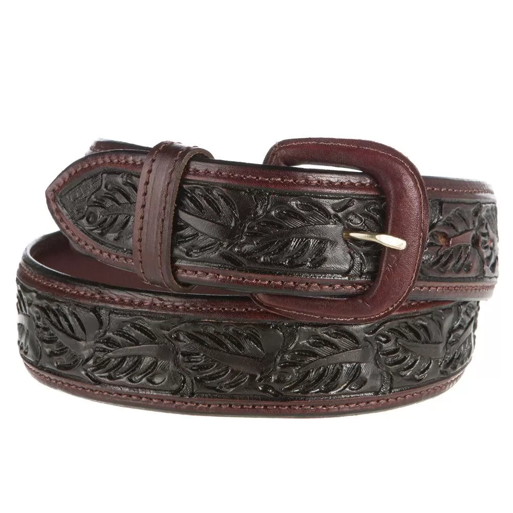 Our saddle brown, dress skived edge leaf tooling pattern is available in 1-1/2″ straight belt – fits 1-1/2″ buckle sets. Item # NRS41-118.