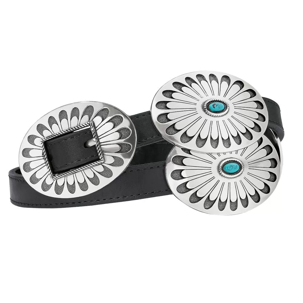 Check out this gorgeous new ladies belt by Brighton. This black belt features beautiful large silver conchos completed with turquoise detailing. Sure to complete any outfit and make a statement!