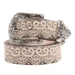 Accessorize your outfit with 3D Belt Company’s Women’s 1 1/2` Brown Belt with Tan Lace Detailing, bordered with rhinestones and silver studs.