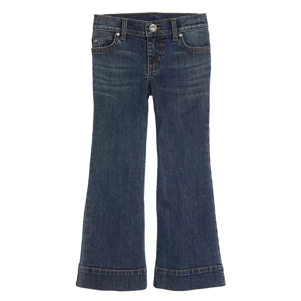 Girl’s western retro jeans with five pocket styling, adjust to fit waistband, trouser opening.